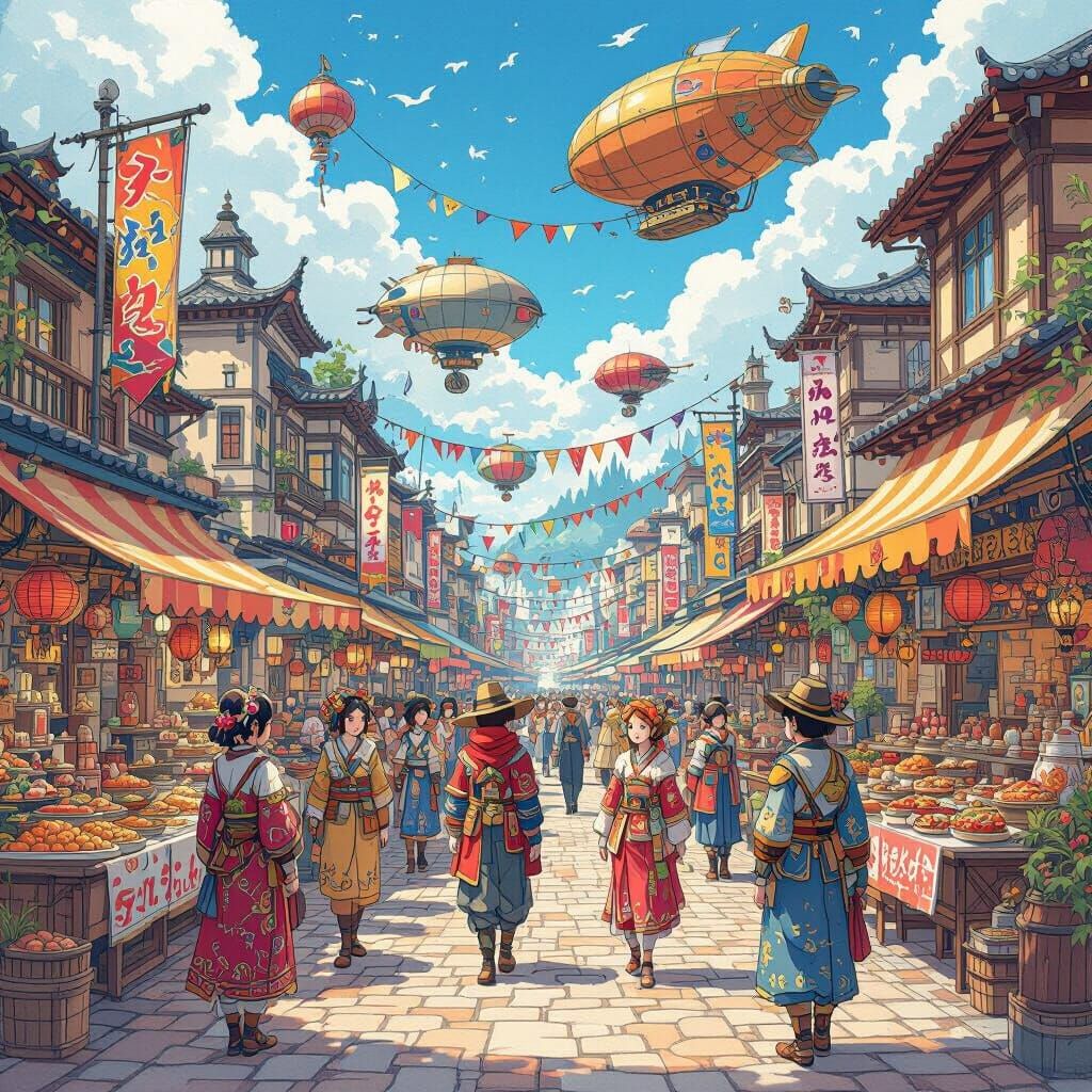 A bustling port city hosts a vibrant festival. The scene features ornate clothing, exotic foods, colorful banners, and whimsical airships in a maximalist anime aesthetic.