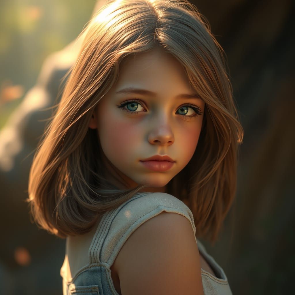 A captivating image of a 13-year-old girl with sun-kissed hair and piercing eyes, set in a mystical environment. The digital painting features rich colors and intricate details, reminiscent of fantasy concept art.