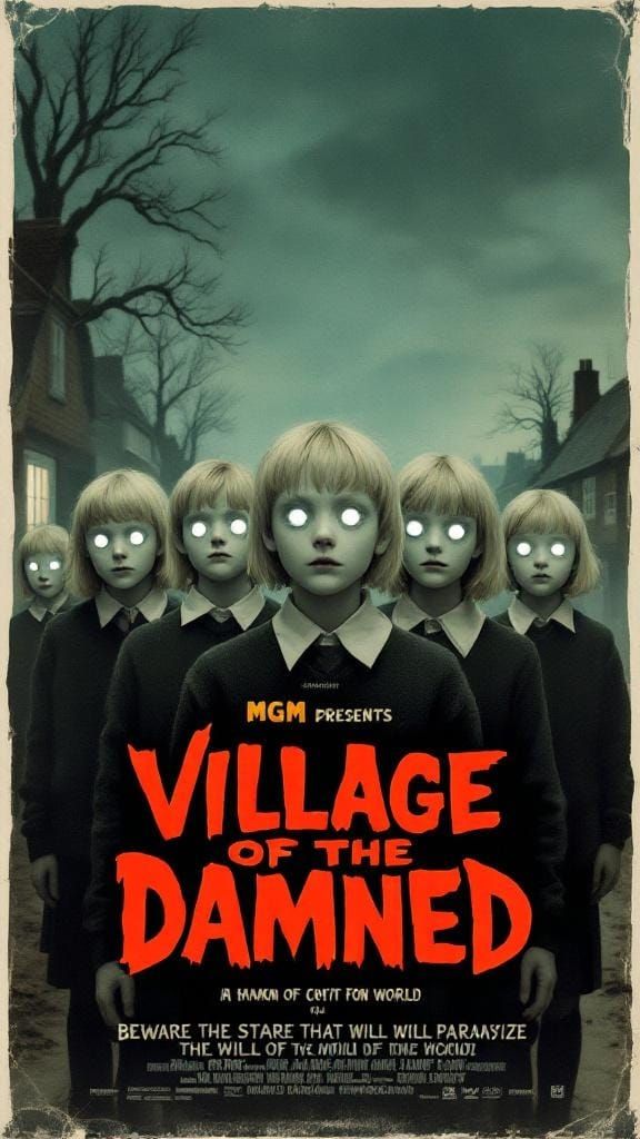 This image shows a vintage horror movie poster depicting six eerie, blond children with glowing eyes. The poster evokes a classic horror aesthetic with muted colors and aged textures.