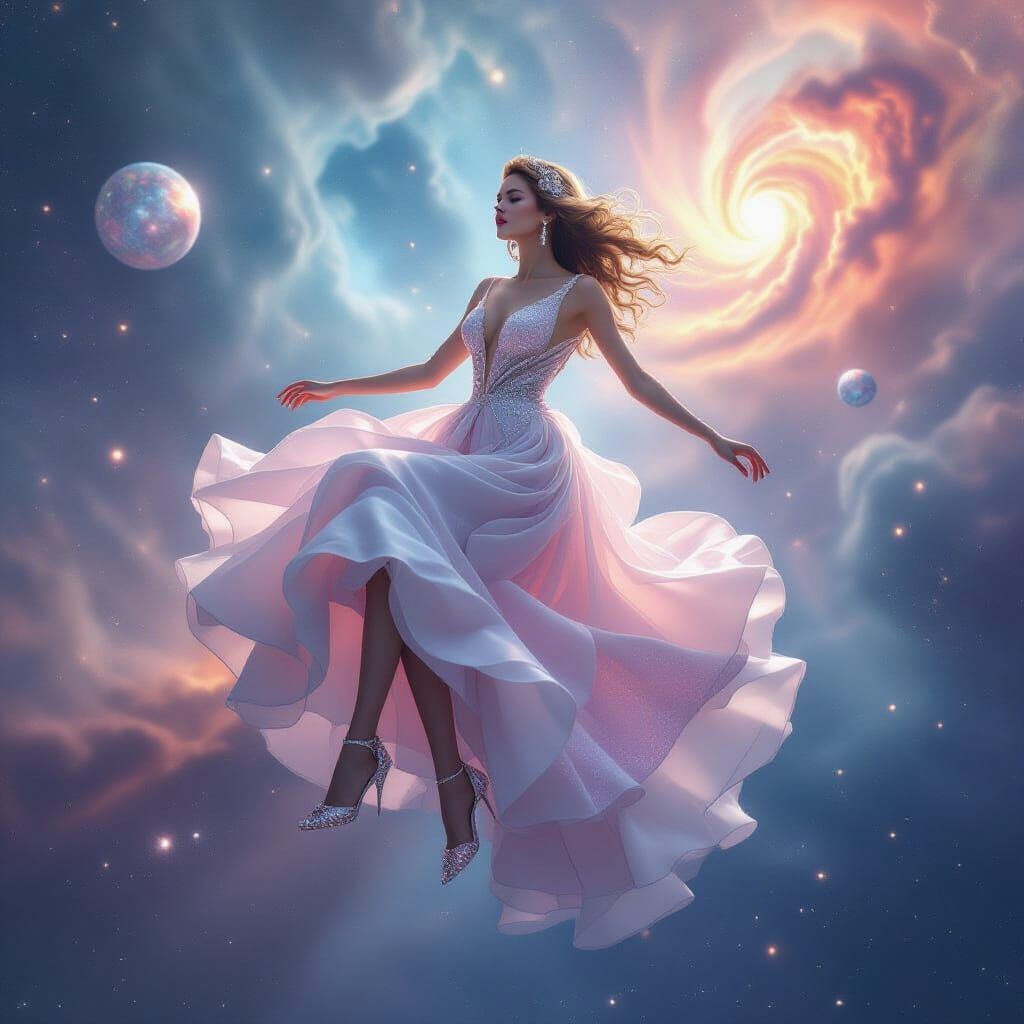 A striking picture of a beautiful girl floating in space. She wears an elegant gown of pastel silks and is surrounded by glowing stars and cosmic dust, as 3D rendered digital art.