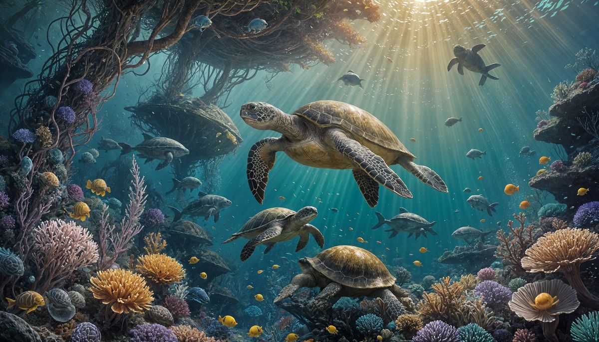 A vibrant coral reef scene featuring translucent fish swimming among sea turtles and glowing anemones. The image is rendered with dynamic lighting and intricate details, in a dark fantasy aesthetic.