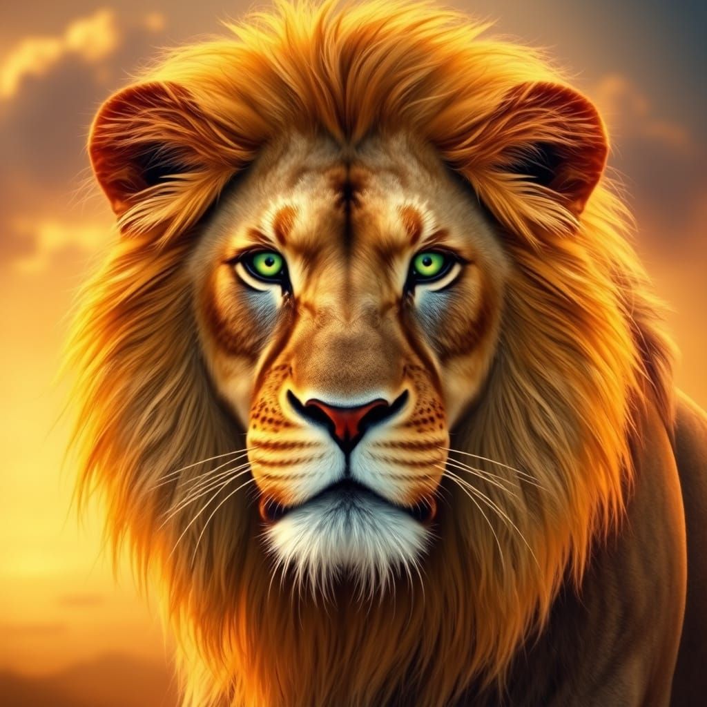 A stunning image of a majestic lion's face, set against a warm savannah background, with a shaggy golden mane and piercing green eyes.