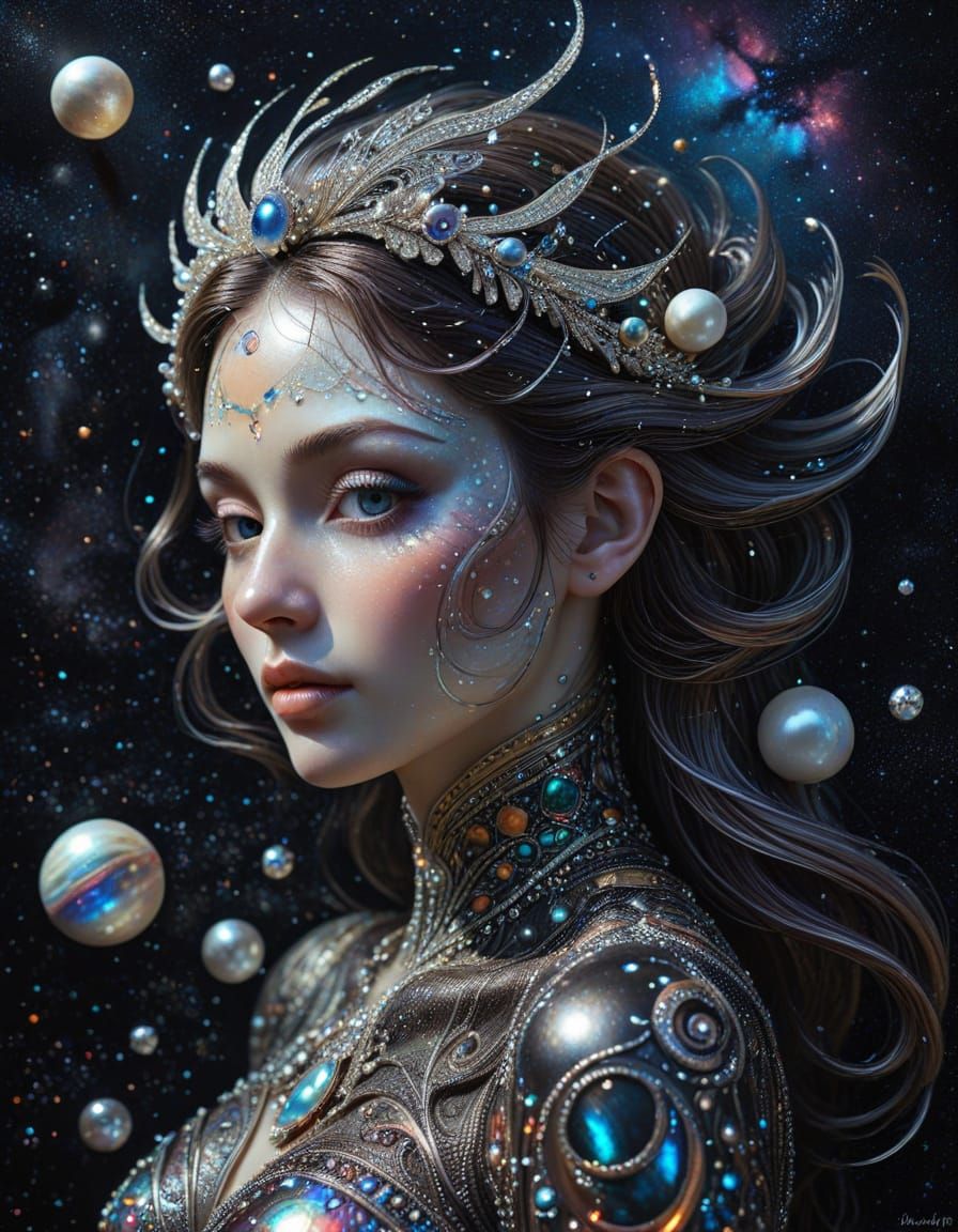 This image shows a beautiful girl set against a backdrop of deep space and pearlescent planets. The artwork is highly detailed with a three-dimensional, hyperrealistic, filigree aesthetic.