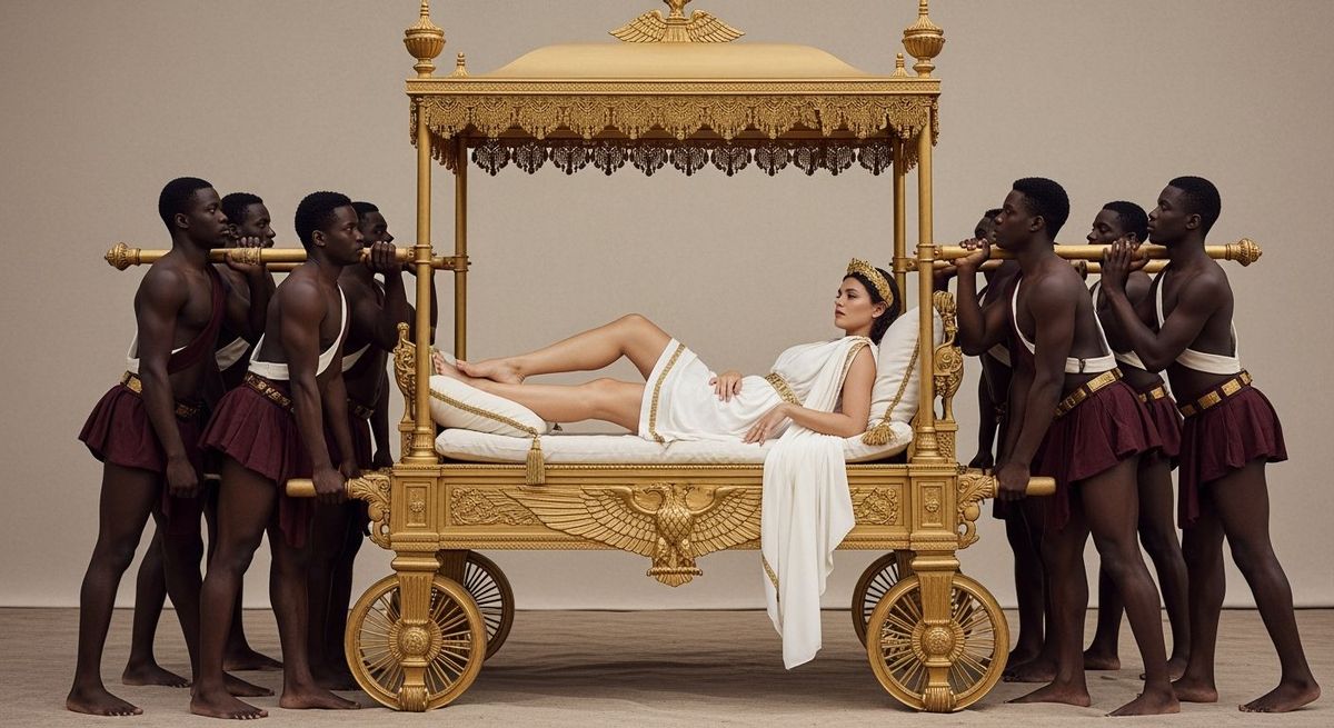 This image shows a Roman Empress lounging on a gold litter carried by servants. The scene evokes classical portraiture with sharp focus, natural lighting and a subtle bokeh effect.