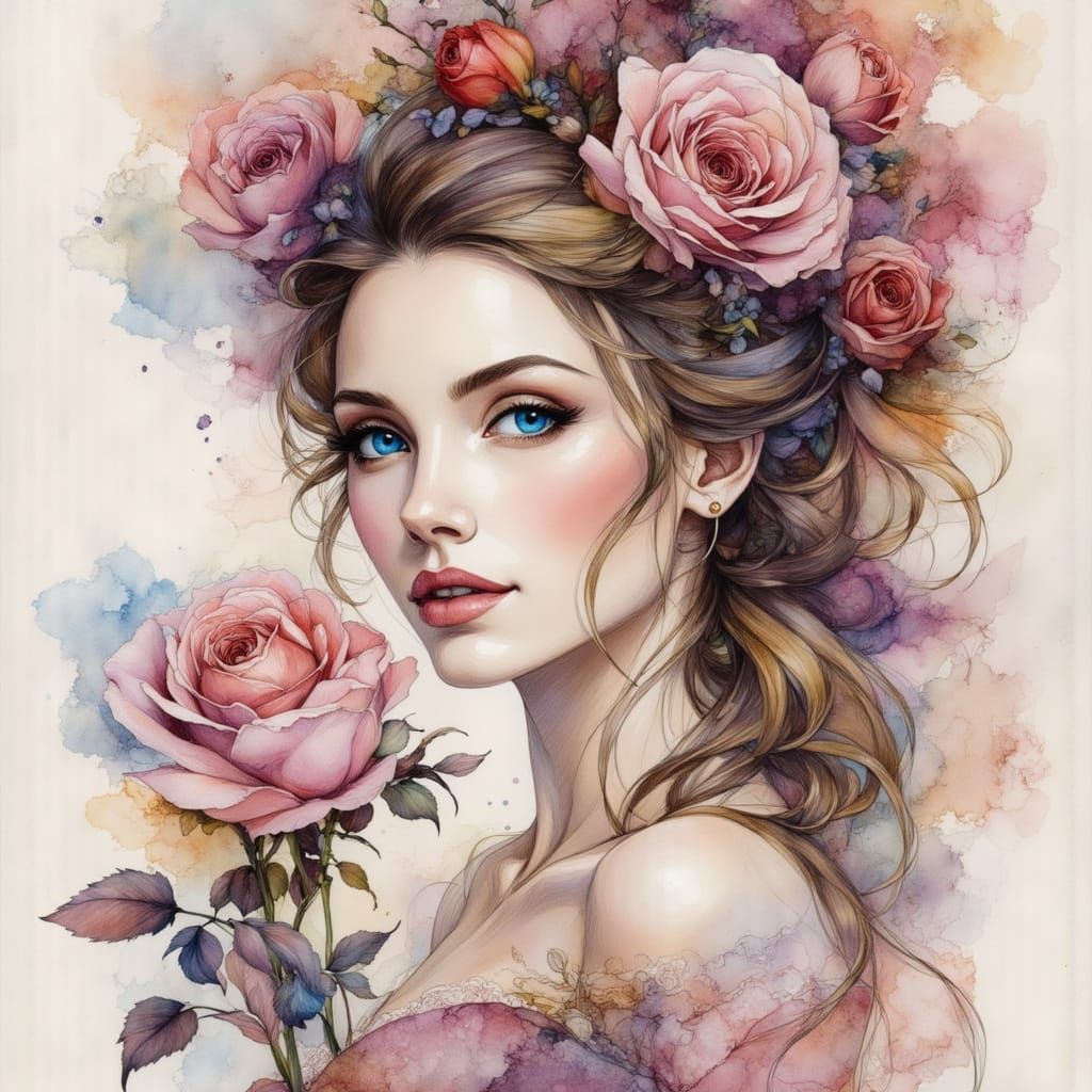 A detailed image of Belle holding a rose. The artwork features layered pen and ink techniques with alcohol inks, creating a beautiful and intricate design.