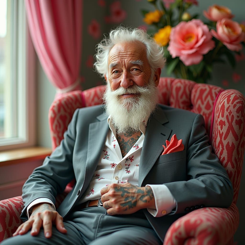 A portrait of a tattooed grandfather in a suit, tattoos visible. He is set against a whimsical backdrop in pastel and pop-art colors, creating a hyper-realistic and surreal image.