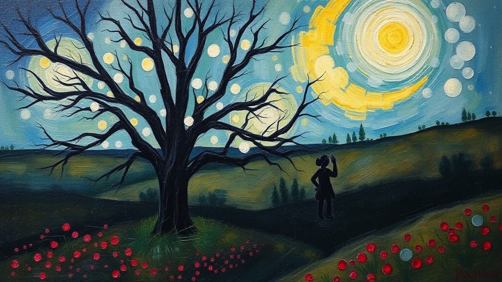 A surreal oil painting in the style of William Blake's Songs of Innocence and Experience. The textured paint and expressive composition evoke a dreamlike quality.