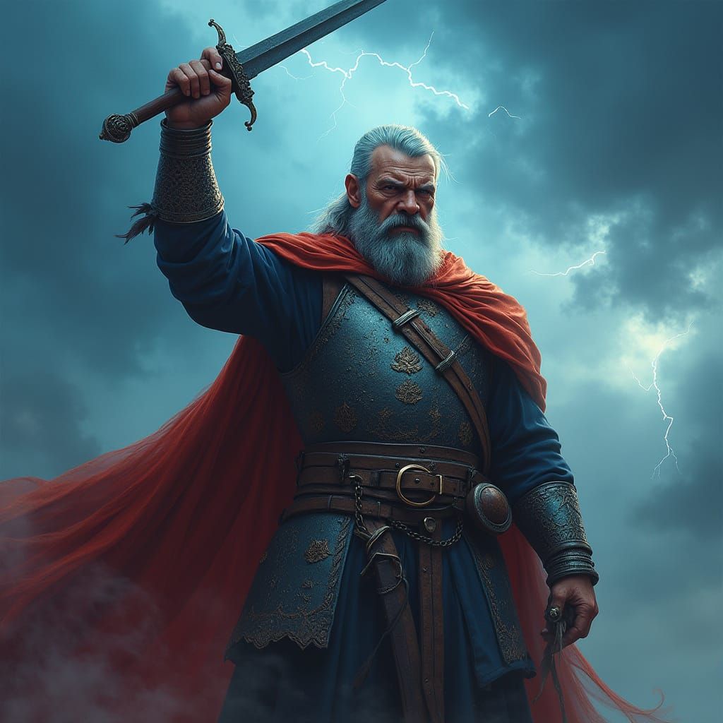 This image shows a Ukrainian Cossack warrior standing strong against a turbulent stormy sky, with intricate detailing and dynamic lighting. Rendered in a highly detailed digital painting style, reminiscent of Unreal Engine 5, with complementary colors and striking contrasts.