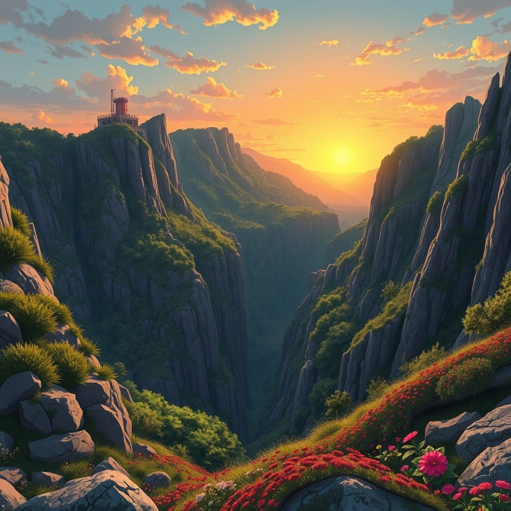 This image captures the serene blend of nature and industry at the Piastre Bagnata quarry, with lush greenery, vibrant flowers, and a warm cinematic sunset, reminiscent of a high-quality anime-inspired artwork with bold lines and cel-shaded aesthetic.