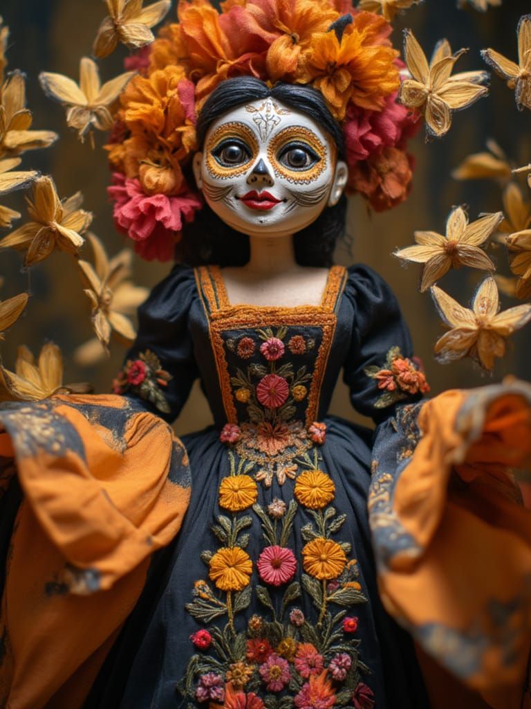 Easily generate your own vibrant Dia de Los Muertos images with colorful flowers and intricate designs for free.