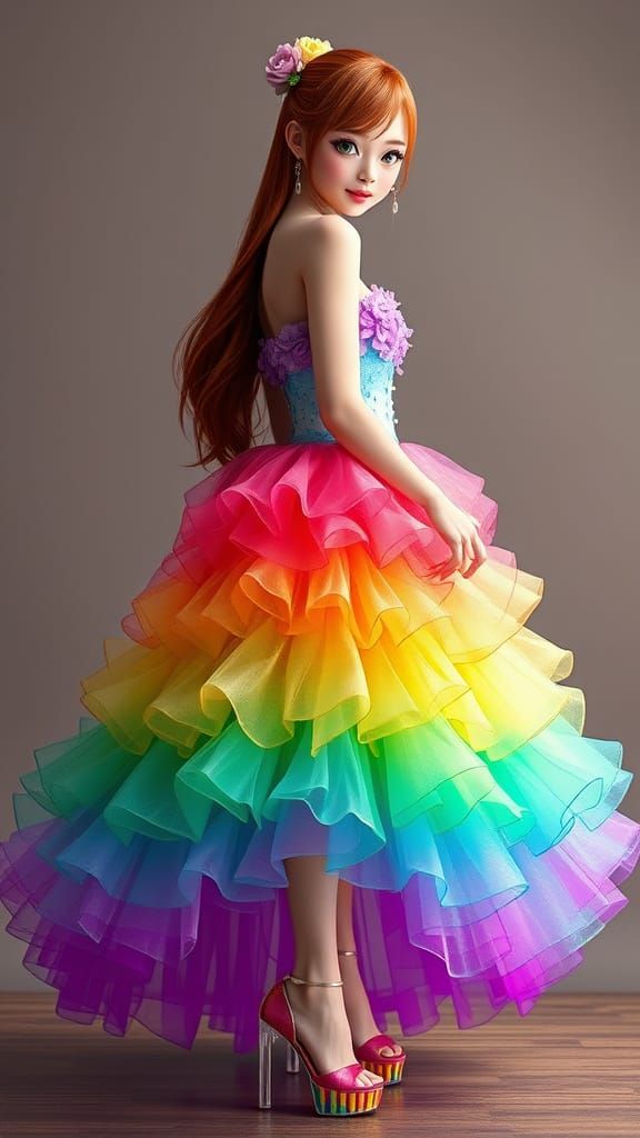 This stunning 3D anime art piece features a petite Japanese woman in a majestic, multi-tiered rainbow-frosted dress, exuding femininity and playfulness, with exceptionally long red hair and piercing green eyes. Rendered in 8K resolution with hyper-realistic details, this artwork embodies breathtaking aes...