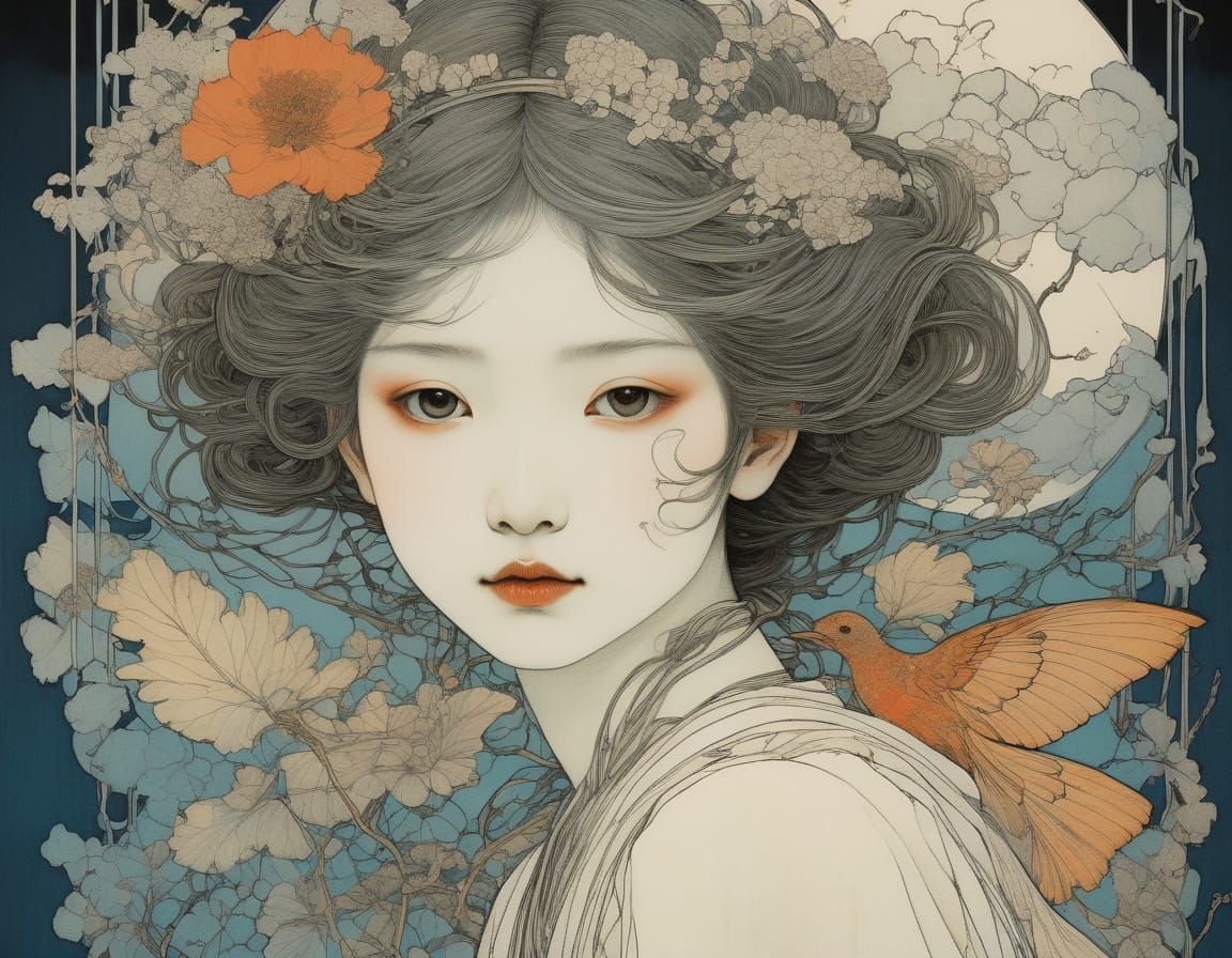 This image showcases a beautiful organic line drawing with a soft pastel summer palette, blending the styles of two masters in a unique and captivating way.