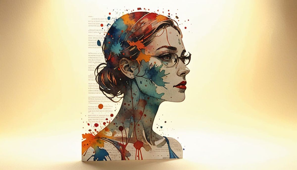 A striking picture of a cardboard cutout woman in a tulle dress and red shoes, set against a native forest landscape at dawn. The art style is 2.5D comic, with vibrant watercolour splatters.