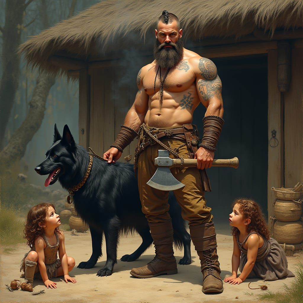 This image shows a rugged warrior standing proudly beside his loyal German Shepherd, holding a massive battle-axe, amidst a warm and welcoming atmosphere, with a rustic wooden home and playful children in the background.