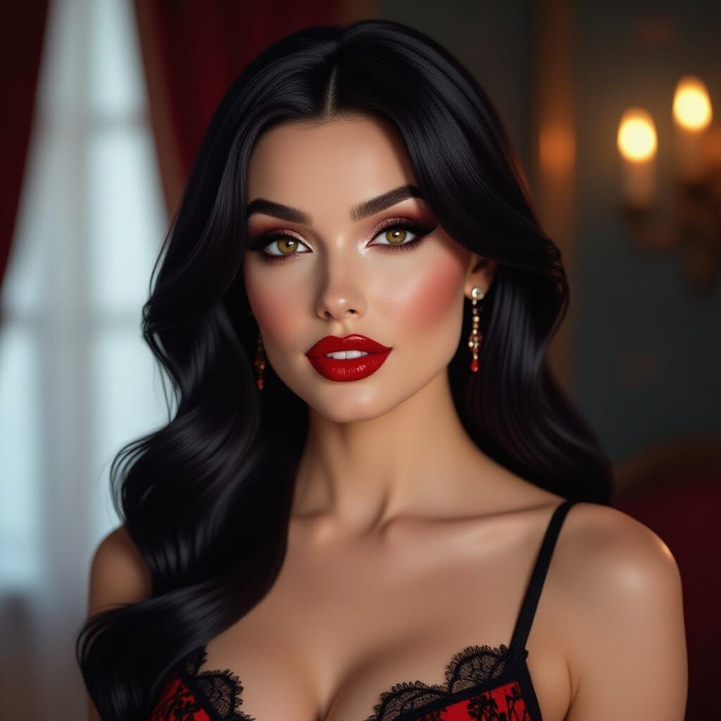 This image shows a photorealistic portrait of Mavis from Hotel Transylvania, featuring midnight hair and red lipstick. Dramatic film noir lighting creates a mysterious atmosphere with subtle vampire fangs visible.