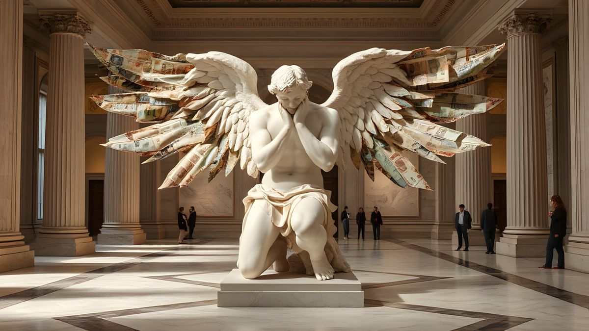 A hyper-detailed marble sculpture of a fallen angel with wings made of weathered banknotes, displayed in a softly lit museum hall. The art is cinematic and hauntingly beautiful.