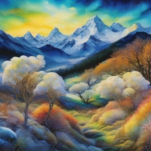 A vibrant stained glass image of a white horse rearing in a lush meadow. Fauvism-style expressionist brushstrokes capture the horse's muscular form amidst a stunning Himalayan landscape in warm golden light.