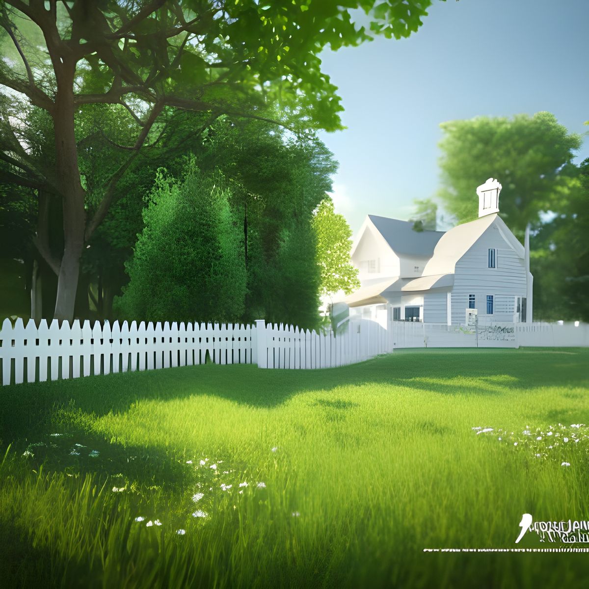 A 3D render of a white farmhouse with a white picket fence and lush garden. A white horse grazes on the perfect green lawn on a sunny day. The image is hyperrealistic.
