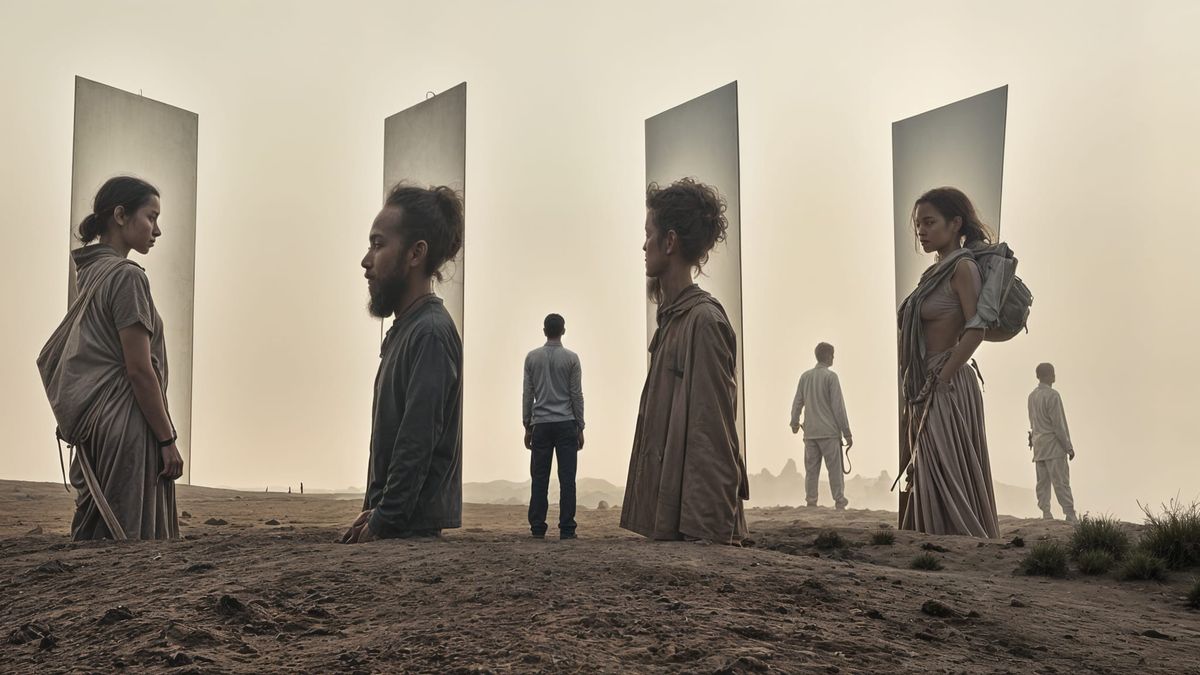 A surreal image of a solitary figure in a barren landscape surrounded by broken mirrors. The artwork evokes symbolism and introspection using muted colors, reminiscent of surrealist paintings.