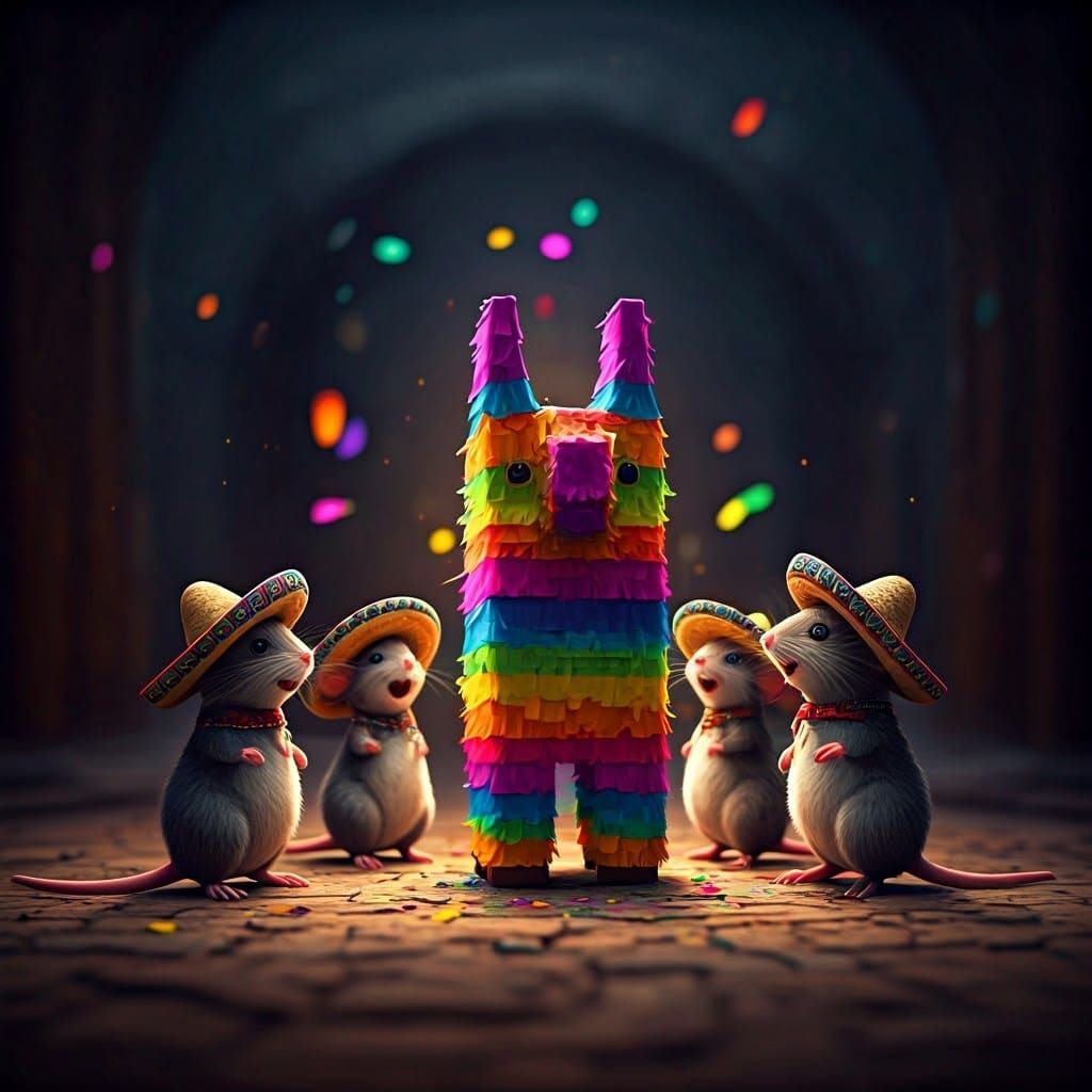 This image shows six mice wearing sombreros celebrating with a piñata. The scene is hyperrealistic with intricate details, high dynamic range, and a cinematic feel in a photorealistic style.