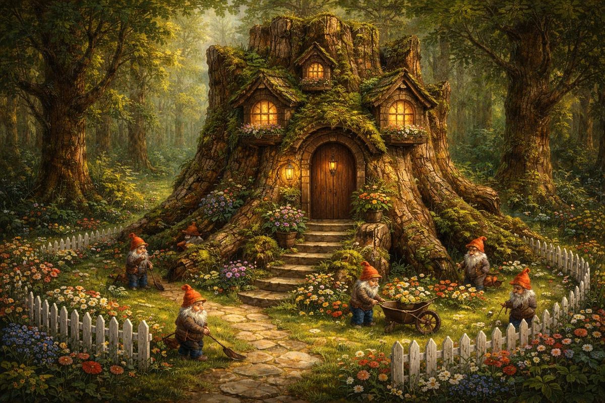 A highly detailed renaissance painting of a gnome home built into a giant forest stump. Features include a wooden door, windows, flower garden, picket fence, and gnomes at work.