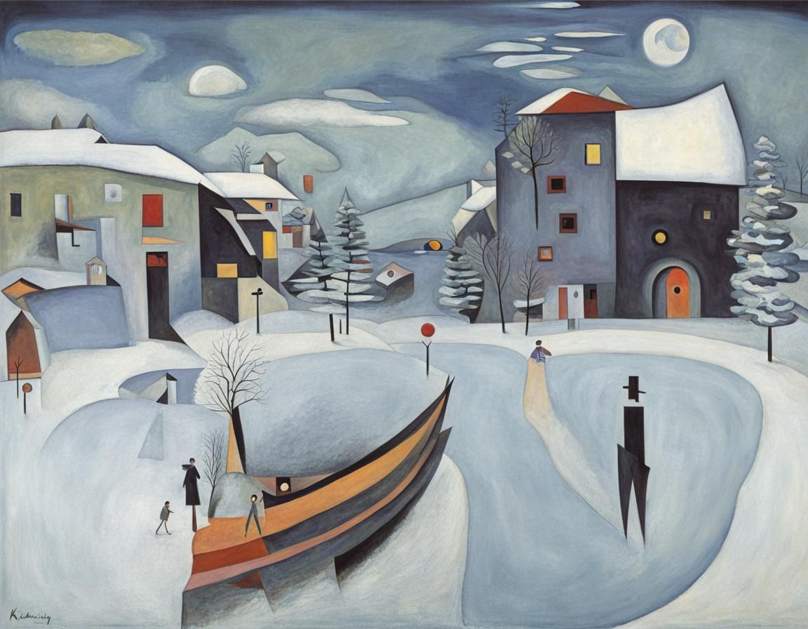 This image shows an abstract surrealist painting. The artwork evokes Kandinsky's style with dynamic shapes and vibrant colors creating a harmonious visual experience.