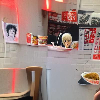 This image depicts a person eating ramen in a noodle shop. The AI-generated art provides a glimpse into an everyday scene.