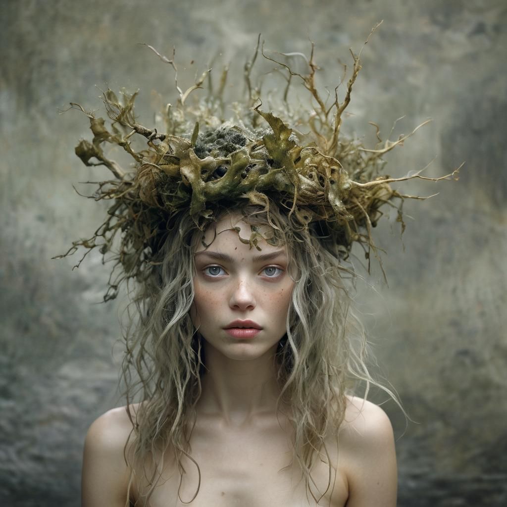 A captivating portrait of a selkie woman adorned with a seaweed crown. The image evokes a mythological and folklore-inspired aesthetic, reminiscent of watercolor and portrait photography.