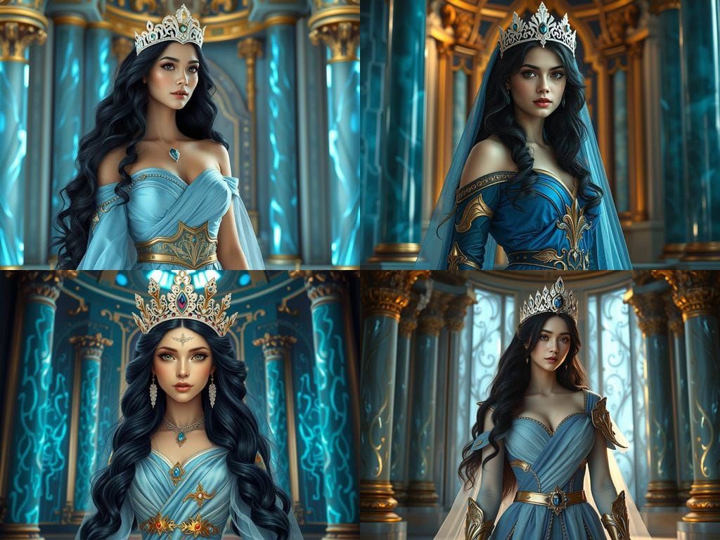 A photorealistic image of a young princess, dressed in a stunning blue gown, adorned with a delicate tiara and veil, standing regally in a grand throne room with crystalline walls and pillars.