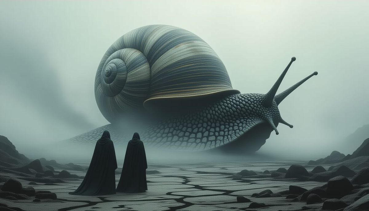 This image shows two robed figures on scorched earth facing a majestic, colossal snail in mystical fog. Rendered in a cinematic fantasy art style, it evokes mystery and awe with desaturated colors and atmospheric perspective.