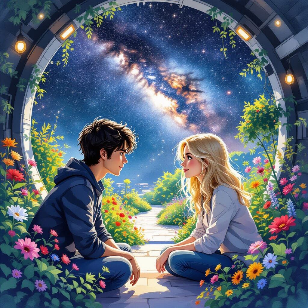 This image shows a watercolor painting of a man and woman in a space garden. The garden is on a space station in deep space, with the Milky Way visible. The style is reminiscent of watercolor art.