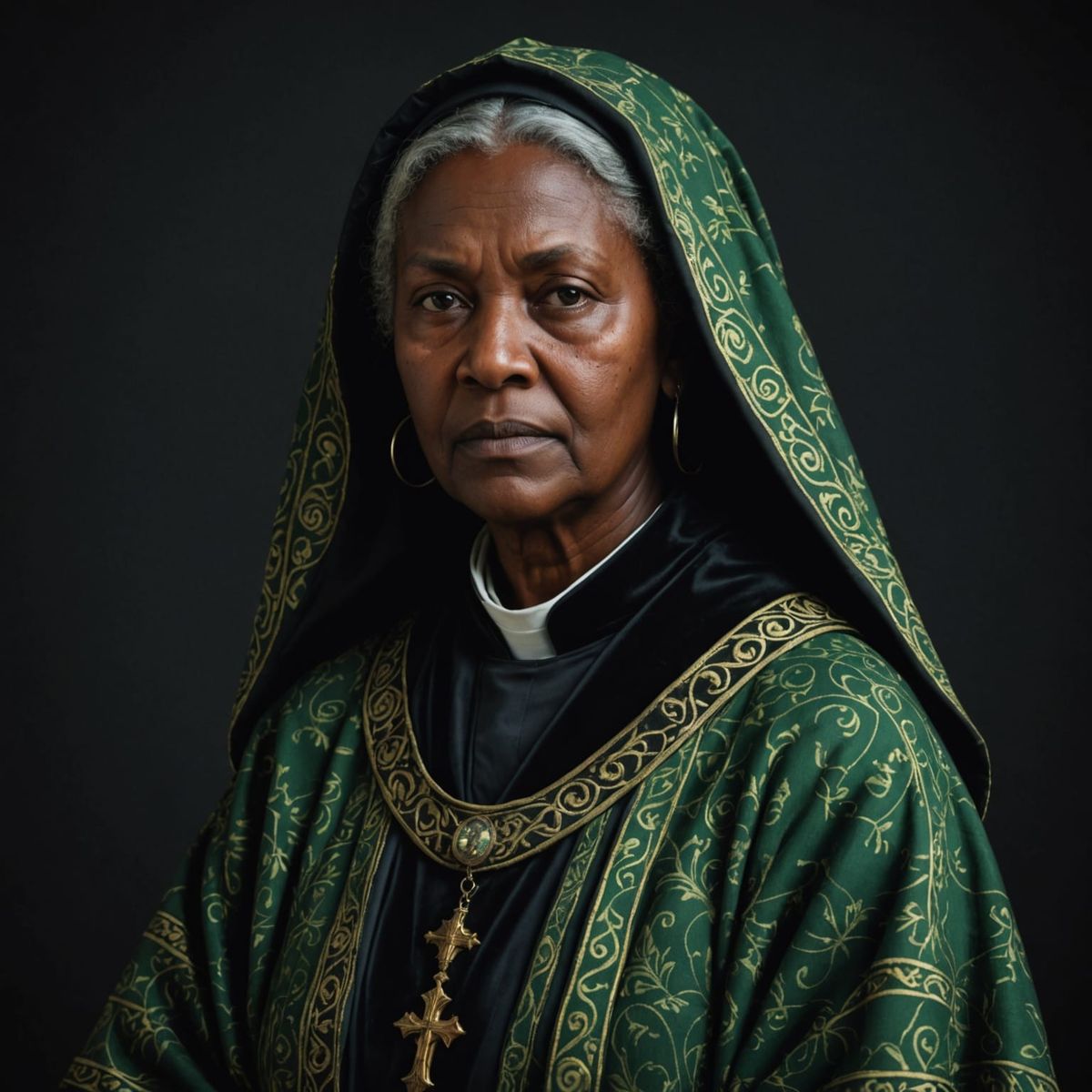 This image shows a realistic portrait of an elderly female nature priest. She has dark brown skin, dark hair and wears a robe with green patterns, set against a dark medieval backdrop.