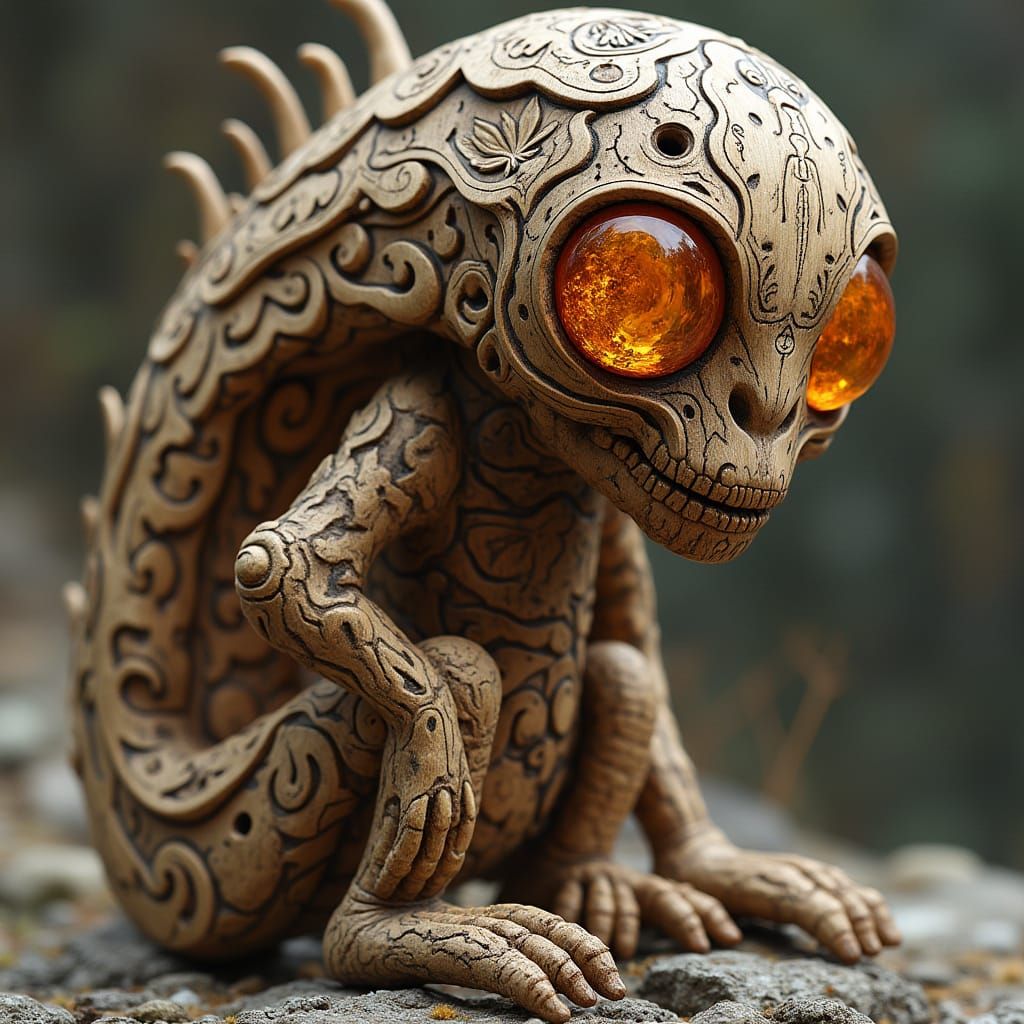 A detailed wooden figurine featuring amber. The design blends industrial and natural elements, showcasing ornate patterns and organic textures, reminiscent of biomechanical and futuristic styles.