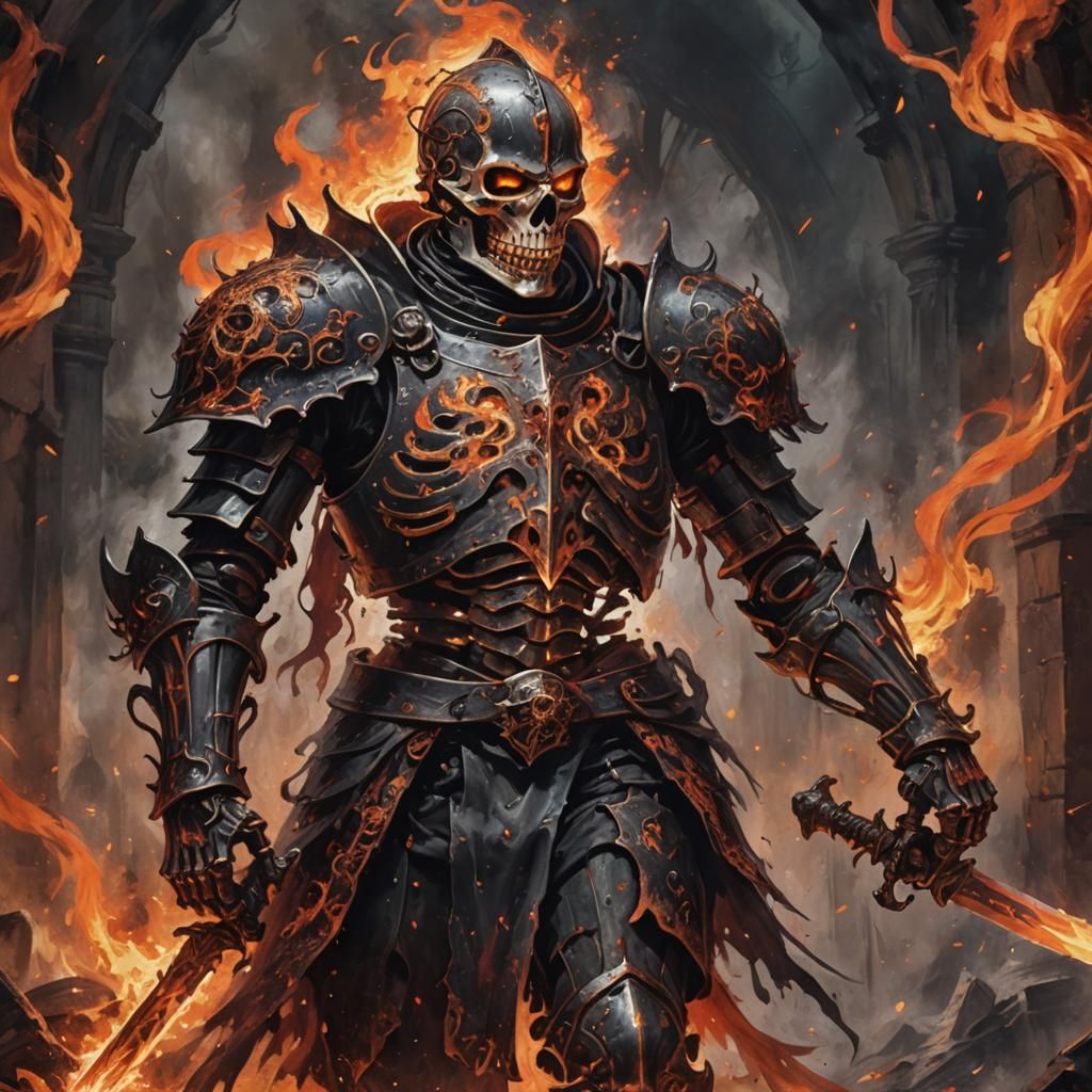 A striking picture of a skeleton knight in dark, ornate armor engulfed in flames. The image features bold brushstrokes, a dark color palette, and dramatic lighting to emphasize the knight's menacing presence.