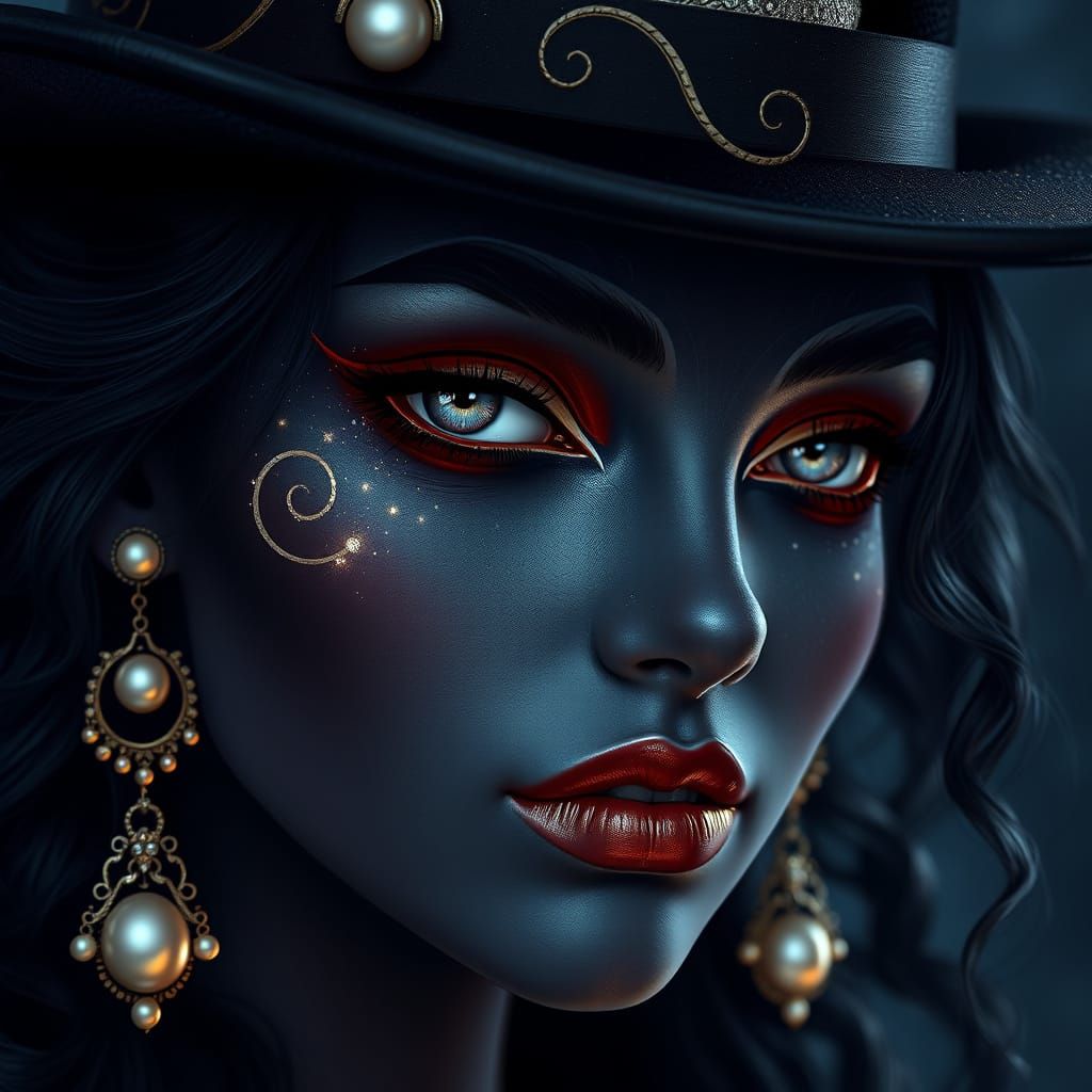 The image is a close up portrait of a woman's face, her face is night as black as oil, She has pale gray eyes. She has exaggerated eye makeup that surrounds both eyes. The woman has a dramatic and artistic makeup of white, red and gold accents creating a striking contrast. The eye makeup is intricate ...
