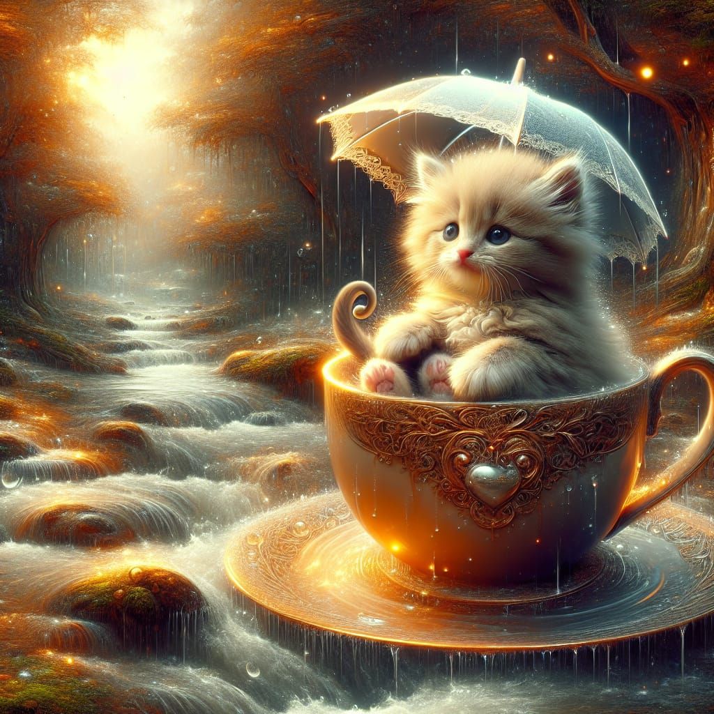 A striking picture of a fluffy kitten in a teacup holding an umbrella. The teacup floats down a stream through an enchanted forest. As hyper-detailed digital art, the image blurs reality and fantasy.