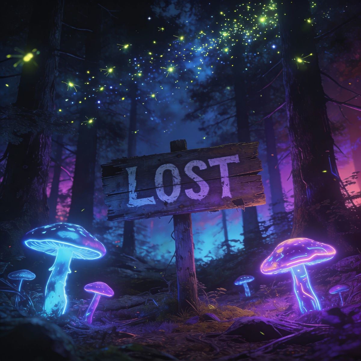 This image shows a lost sign in a dark forest filled with glowing neon mushrooms and bioluminescent fireflies lighting the trees, presented in a vivid synthwave style.