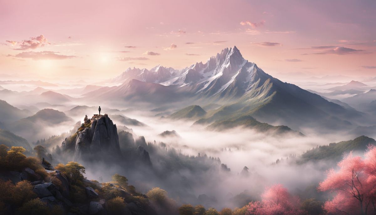 A scenic aerial view of mountain peaks piercing through a dense fog, illuminated by soft pink morning light. A small boy on a misty boat floats in the sky, exhaling fog in this photorealistic image.