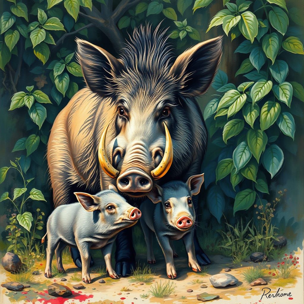 This vibrant artwork depicts a protective female wild boar standing strong amidst lush foliage, a powerful representation of motherly love in a stunning Gouache-style piece that blends Watercolor and Impressionist techniques with thick, textured brushstrokes and impasto layers.