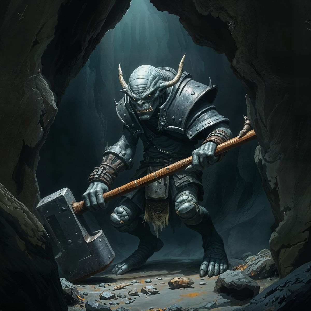 This image shows a lean orc with grey skin, long arms, and short legs, clad in steel armor and holding a hammer while concealed within a cave.