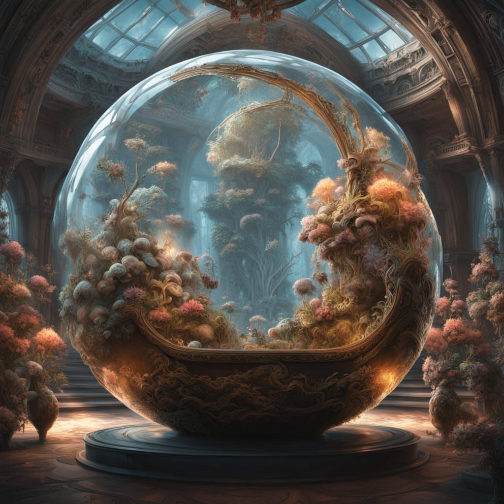 This image showcases a vast, intricate alien world enclosed within a glass sphere. It features luminescent plants, crystalline rocks, and a star-filled sky, rendered in a dramatic, ethereal digital art style.