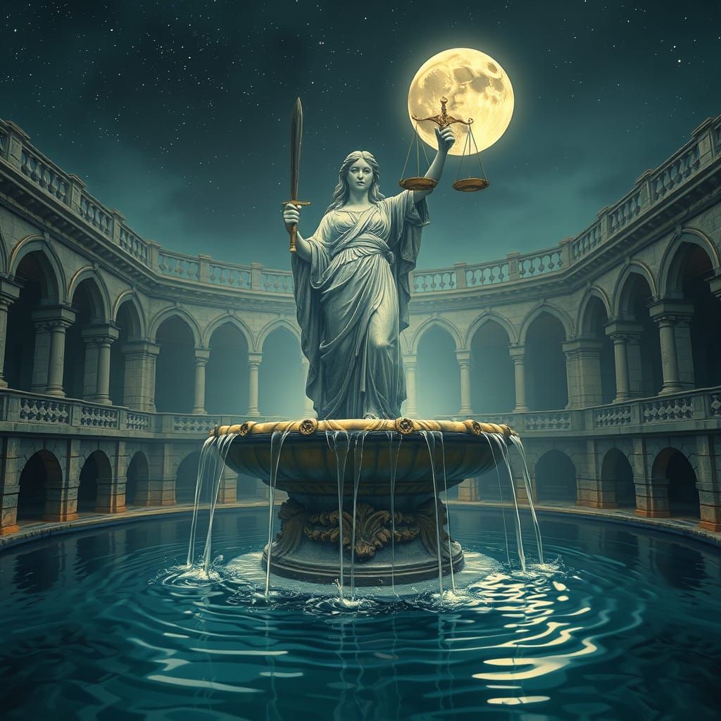 This image shows a Lady Justice fountain in a moonlit courtyard. The statue is adorned in flowing robes, holding scales and a sword, with water rippling in the style of digital art.