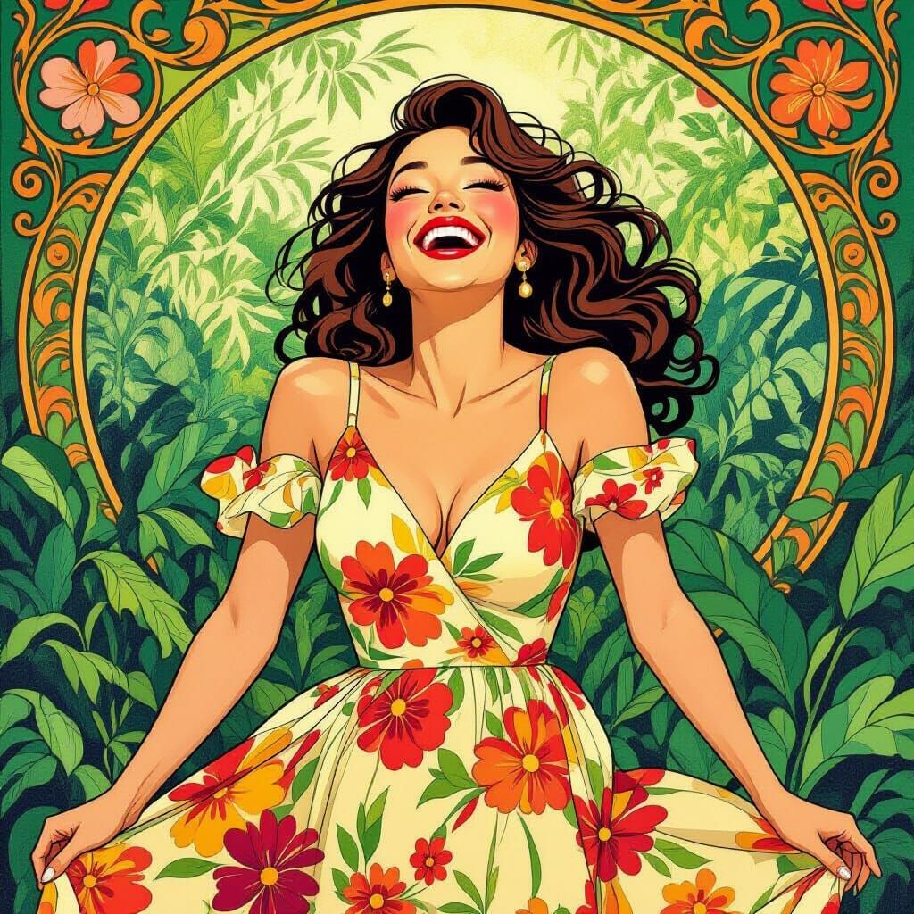 A joyful woman in a floral dress laughs amidst lush greenery. This artwork is reminiscent of art nouveau with bold lines, swirling patterns, and vibrant colors.