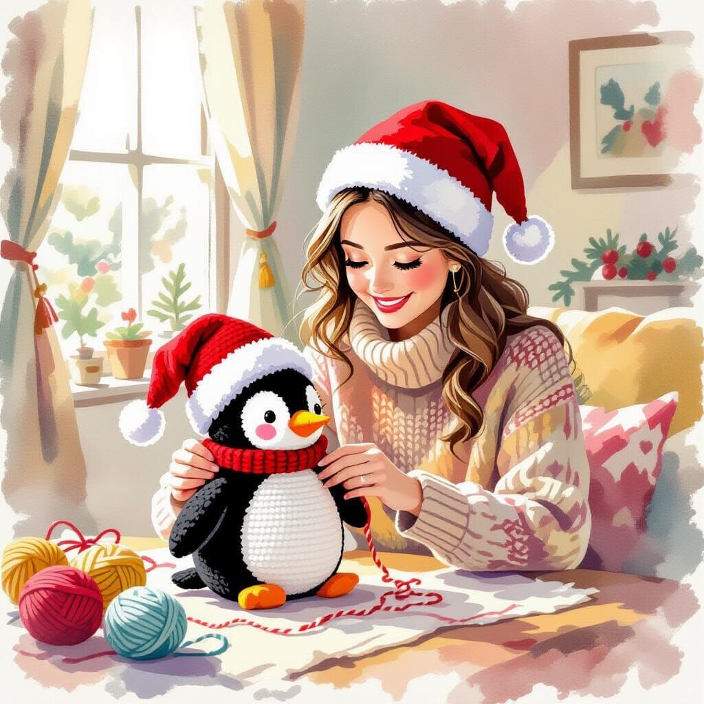 This image shows a cheerful housewife crafting a crocheted penguin with a Santa hat in a warm, inviting living room. Rendered in a loose watercolor style with visible brushstrokes and vibrant colors.