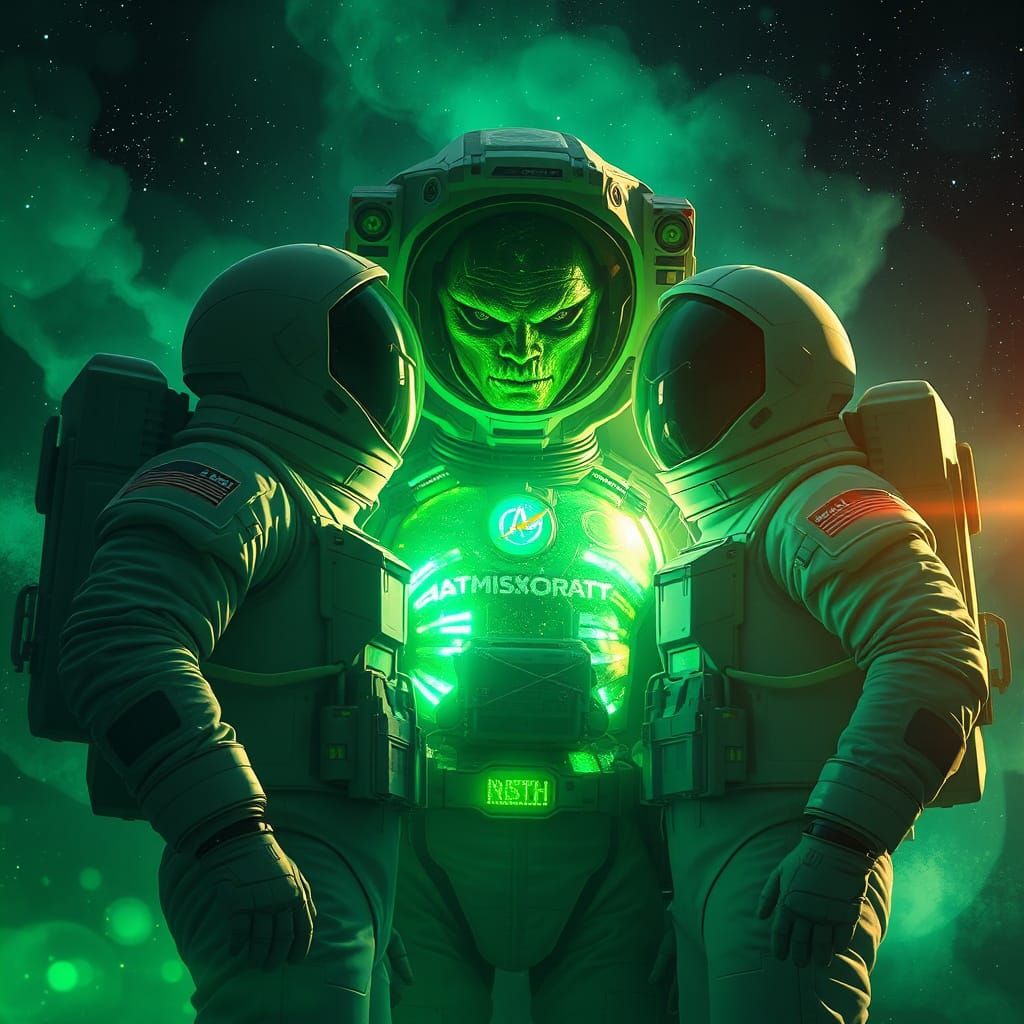 This digital matte painting showcases NASA astronauts encountering Martian Manhunter amidst swirling cosmic dust and nebulae. Features vivid greens and blues with dramatic lighting, rendered in a detailed, awe-inspiring sci-fi concept art style.
