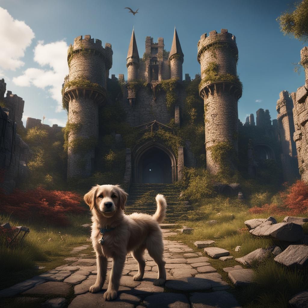 This image shows a large puppy near the ruins of a medieval castle. The scene is a detailed matte painting with deep, complementary colors and intricate details, rendered as fantasy concept art.