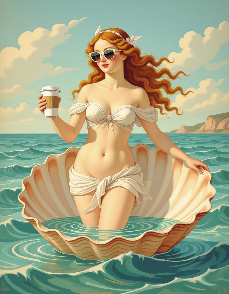 A humorous take on a classic painting, featuring Venus in sunglasses with a coffee cup, rendered in a soft Renaissance pastel palette with detailed brushstrokes.