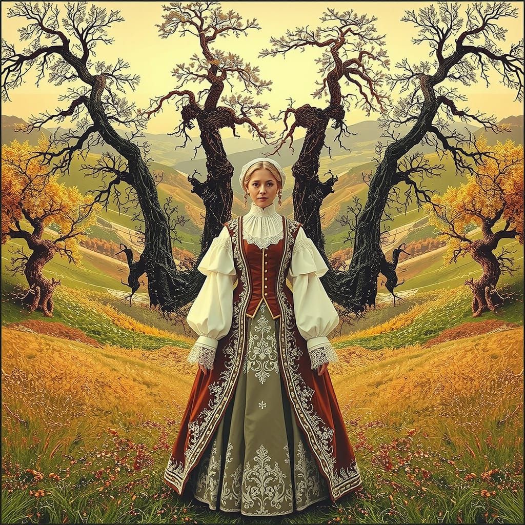 This image shows a figure in antique clothing with lace and embroidery, standing in the French countryside. Soft, golden light illuminates the photorealistic details and subtle color palette.