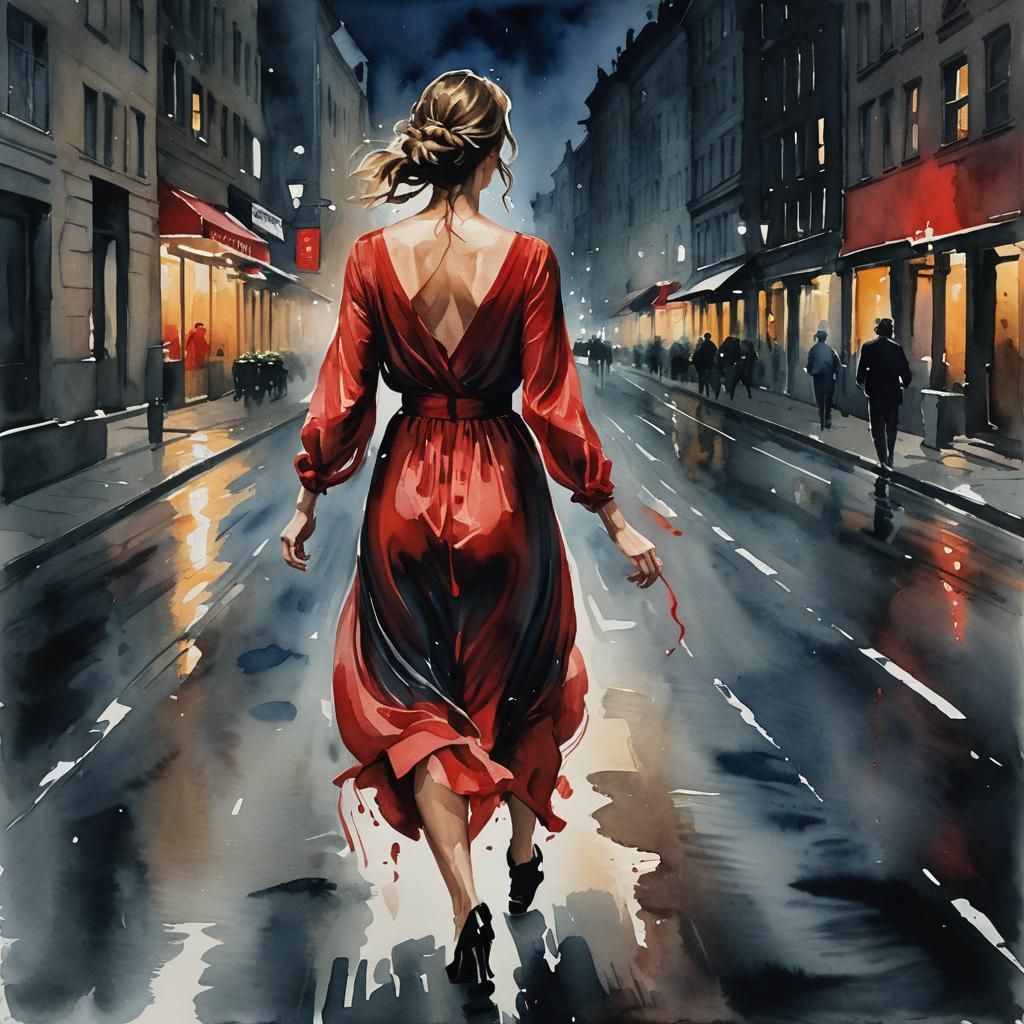 This image shows a woman in a red silk dress running through a dark city street at night, rendered as a watercolor painting. The piece uses thick brush strokes and impasto techniques.