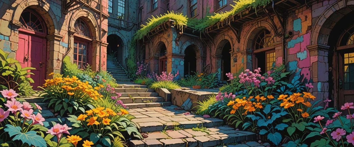This image shows abandoned factory buildings in an industrial wasteland, rendered in a comic book style. The scene features vibrant indigo, magenta, and mossy green hues with volumetric lighting.